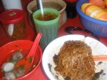 Danach goennten wir uns nochmal ein Taxi zum Hostel, was wir nach einigem Suchen auch schliesslich fanden. Das Zimmer ist ok, aber mehr als ein Bett und ne Klimaanlage brauchen wir eh nicht. Nachdem wir endlich geduscht und uns umgezogen hatten, machten wir uns auf, um unsere Gegend ein wenig zu erkunden. Uns wurden diverse Massagearten angeboten, die wir aber vorerst mal ablehnten, ich will ja ne ordentliche Massage irgendwo am Strand 😉 Dann suchten wir nach Nahrung und fanden schliesslich ein paar chinesische (jedenfalls denken wir, dass es Chinesen waren) Staende. Dort entschieden wir uns fuer Beef Noodles und dazu kam dann noch ne Suppe wo undefinierbare tierische Kleinteile rumschwammen (eins sah echt so aus wie dieser Hoden, den irgend so ein C-Promi damals im Dschungelcamp essen musste), Naja ich hab die Finger von gelassen, aber Jenny hat mal ein Stueck probiert, war wohl nicht so toll . Aber die Nudeln warn lecker, nur wissen wir immer noch nicht genau, was da noch an den Nudeln dran war, sah aus wie kleingematschte Insekten, aber fuer umgerechnet einen Euro war es super. Dann haben wir uns noch Schneematsch geholt und sind noch kurz in der Brut rumgeschlendert und jetzt machen wir uns noch nen gemuetlichen auf der Terrasse und geniessen die Freiheit ohne Arbeit, hihi. Grad haben wir noch Sean aus Nordirland kennen gelernt, der auch als Backpacker unterwegs ist und haben kurz mit ihm gequatscht, ach ja Hostels sind schon cool J So ich chill mal weiter und meld mich dann bald wieder bei euch. Hier noch ein paar Bilder von heute 🙂