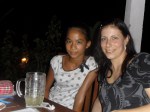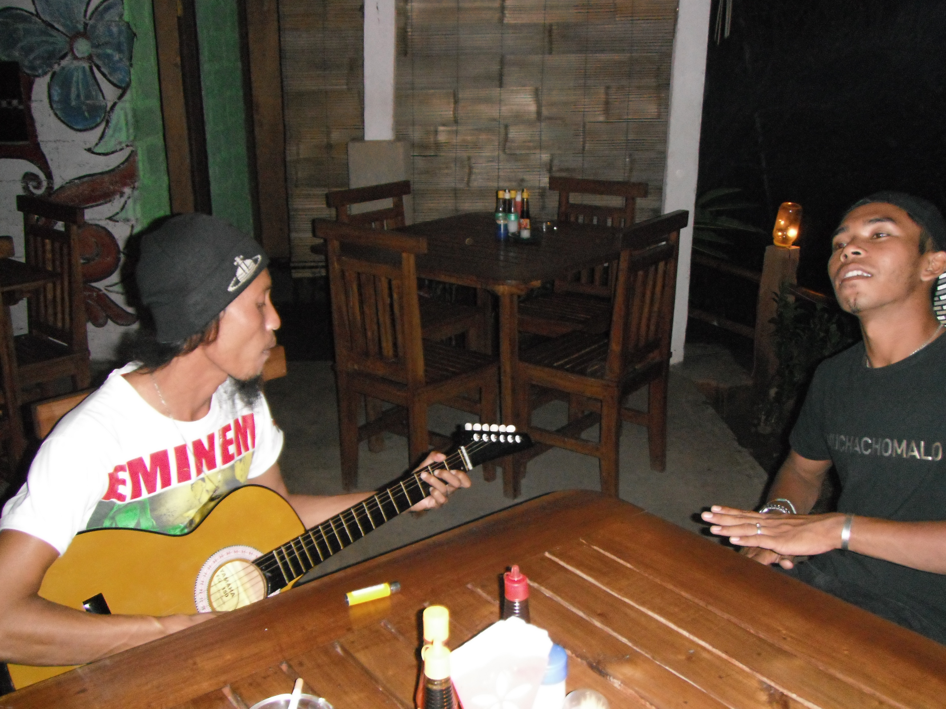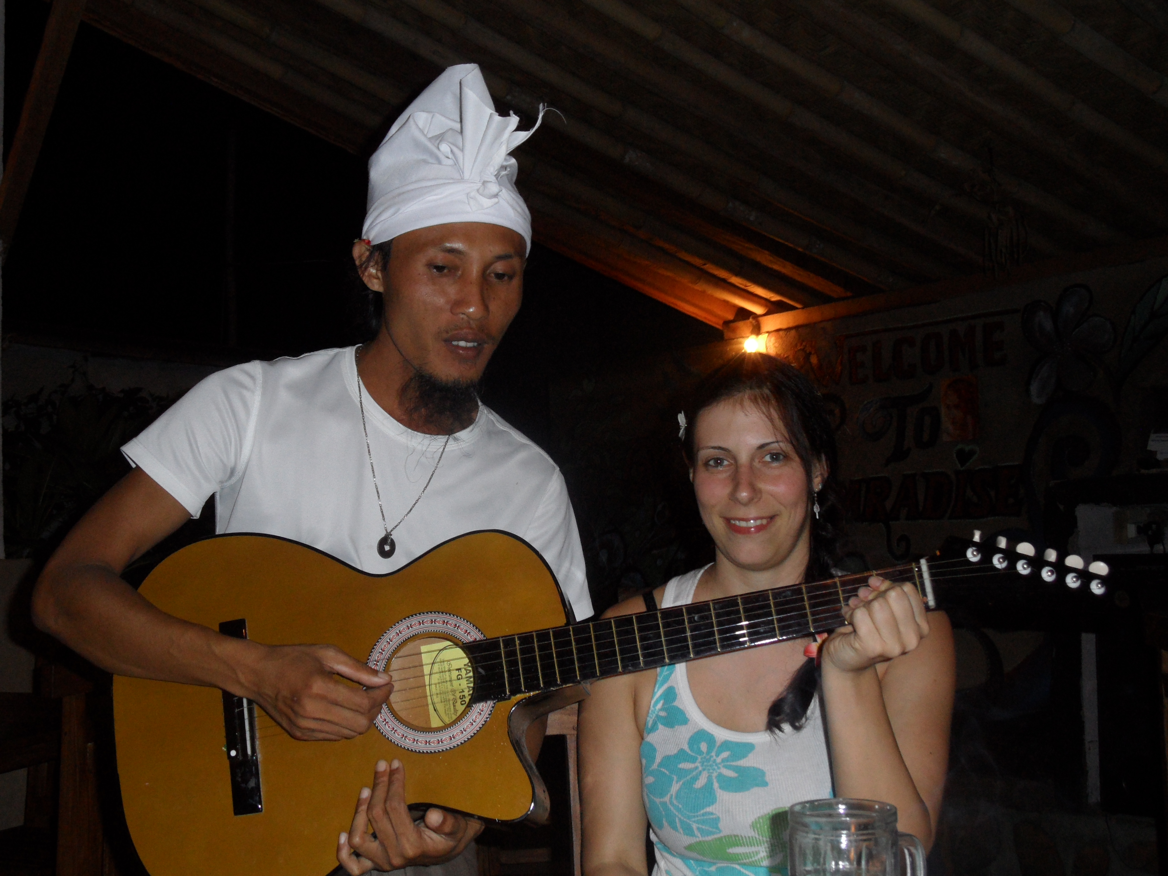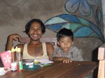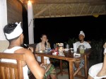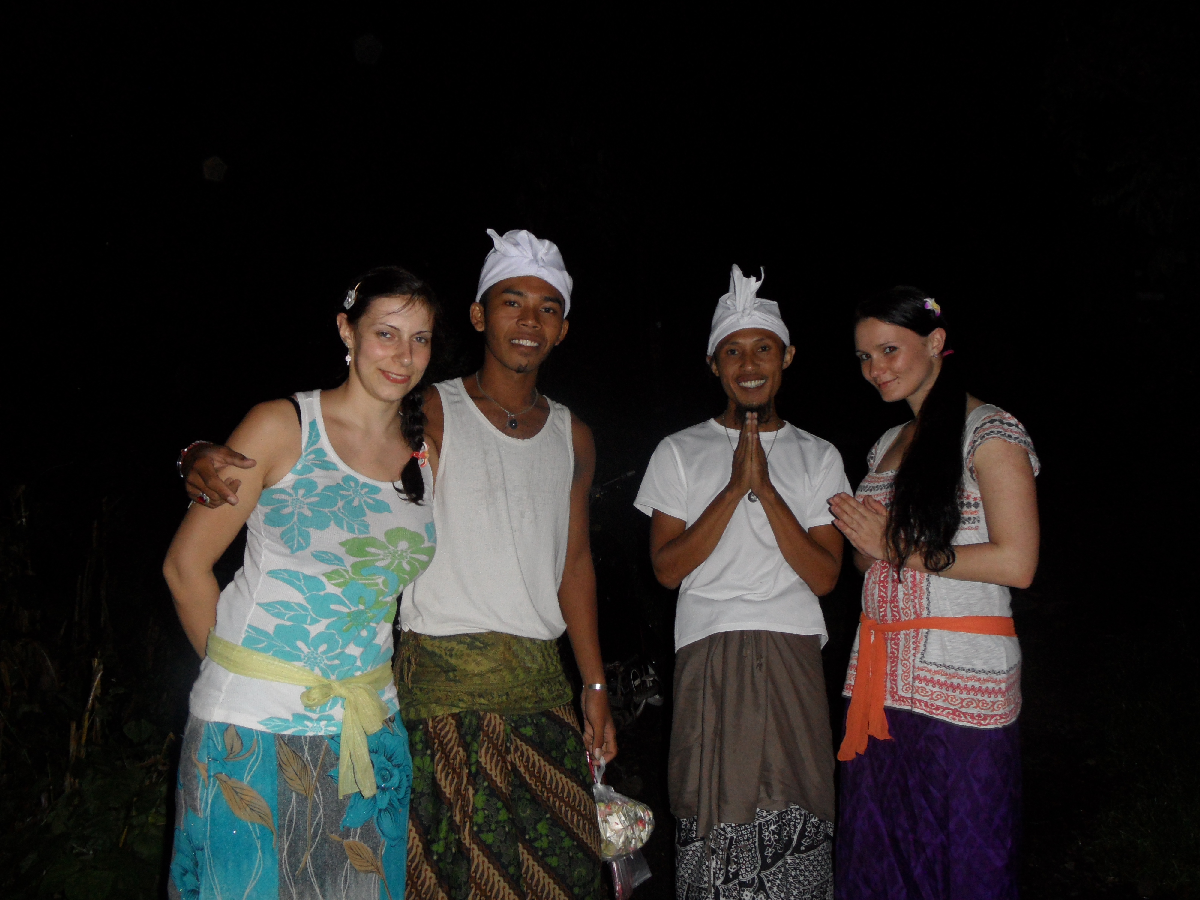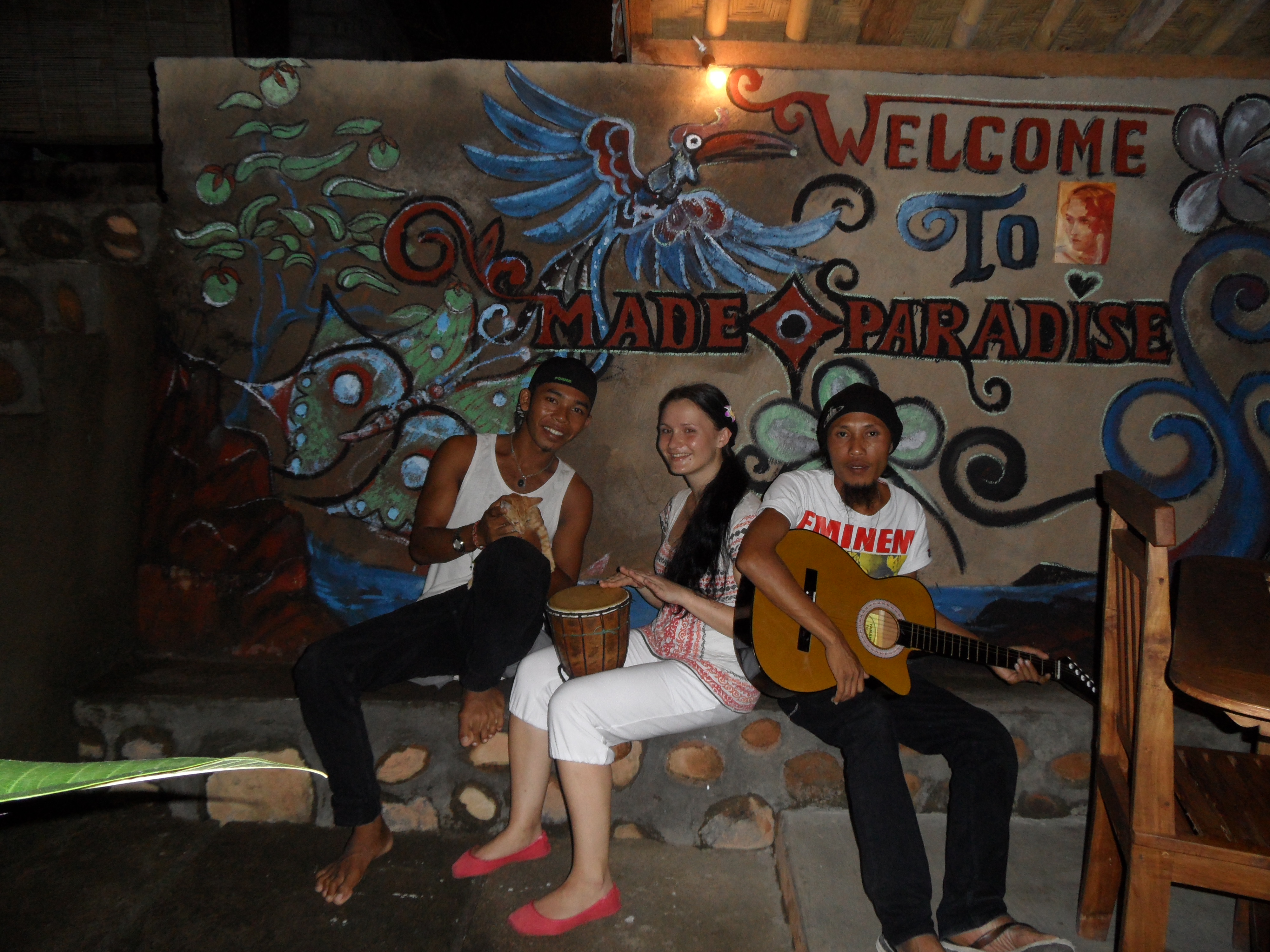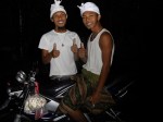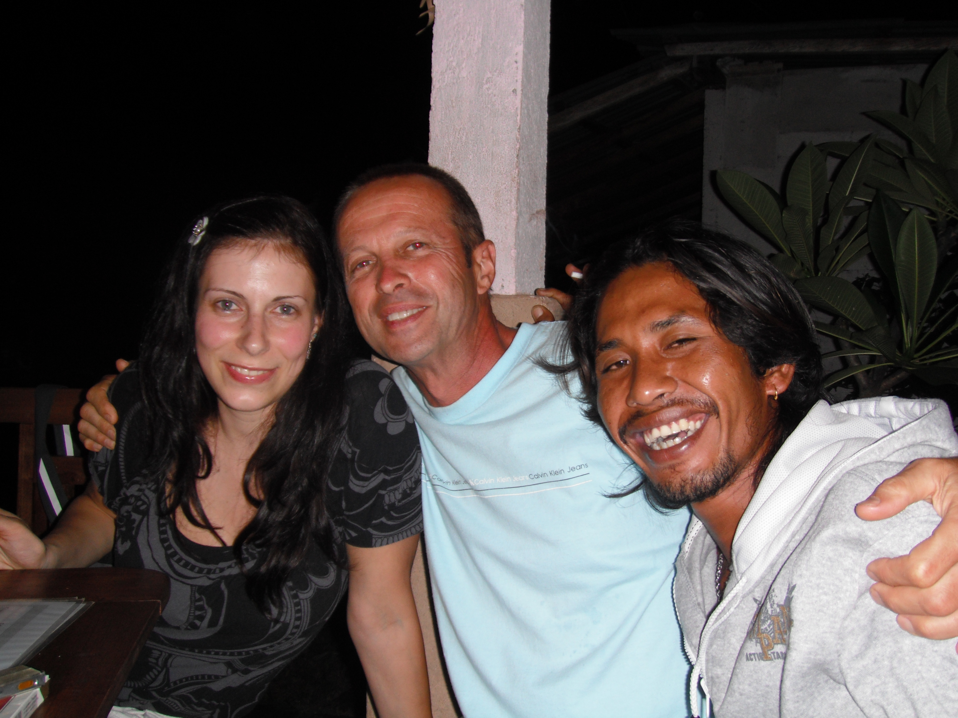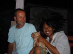 Dann zeigte er uns noch wie wir an den Sandstrand kommen koennen, weil der vorm Hotel nur aus Steinen bestand. Nach ner Kletteraktion durch den Urwald im Handtuch, fanden wir ihn schliesslich. Ultraschoen! Schwarz-braun gemischter feiner Sand und fast keine Menschenseele dort, so was hab ich noch nicht gesehen. Badeten dort noch eine Weile und trafen da auf Greg, aus Frankreich, der den Bungalow neben uns hat. Greg wohnt auch schon seit einigen Jahren auf Bali. Abends haben wir dann wieder im Hotelrestaurant gegessen und uns zu Ilu gesetzt, die uns dann gleich einen Arak Cocktail mixte, mmmh lecker! Koennte abhaengig davon werden 😉 Arak ist ein balinesischer Likoer oder Schnaps. Diesmal gabs fuer mich balinischen Fischspiess mit Reis & sehr viel Knoblauch, unglaublich lecker! Greg, Dede und sein Kumpel Ari gesellten sich dann noch zu uns und wir tranken da noch ein bisschen Arak. Dann fuhren Jenny und ich mit Dede und Ari auf dem Roller 500 Meter weiter in das besagte Warung (was Bistro bedeutet). Dort holten die Jungs Bongotrommeln und Gitarren raus und wir starteten die Jamsession und eine der besten Naechte die ich jemals erleben durfte! Der Abend war einfach der Hammer! Made, dem das Bistro gehoert, setzte sich noch mit dazu, dann kam Greg noch und spaeter ein anderer Freund von den Balinesen und die 13 Jaehrige Nachbarin von Made setzten sich schliesslich auch noch rueber. Die Jungs sangen und spielten die Instrumente, waehrend wir Arak tranken und die Musik und die herrliche Stimmung genossen. Nach einer Weile uebergab man mir dann die Bongos und nach ein wenig Uebung trommelte ich dann (hoffentlich) im Rhythmus mit 😉 Ein Katzenbaby sass waehrend der Nacht dann noch abwechselnd auf meinem und Jenny’s Schoss und ich hab es schliesslich wegen der Farbe Cinnamon (Zimt) getauft 😉 Als den Jungs und mir die Zigaretten ausgingen, bin ich mit Dede nochmal auf dem Roller losgefahren, um welche zu besorgen. Ich glaub so frei wie dort drauf hab ich mich noch nie gefuehlt. Hier traegt anscheinend niemand nen Helm und die Haare haben im Wind geflattert, herrlich 😀 Keine Angst liebe Familie, wir sind ca. 10 km/h gefahren, dafuer hab ich schon gesorgt 😉 Bis fast halb eins sangen und tranken wir noch und dann ging es per Roller wieder zurueck zum Hotel. Mussten da erstmal einen vom Personal aufwecken, da wir den Schluessel da abgegeben hatten, upps 😉
