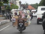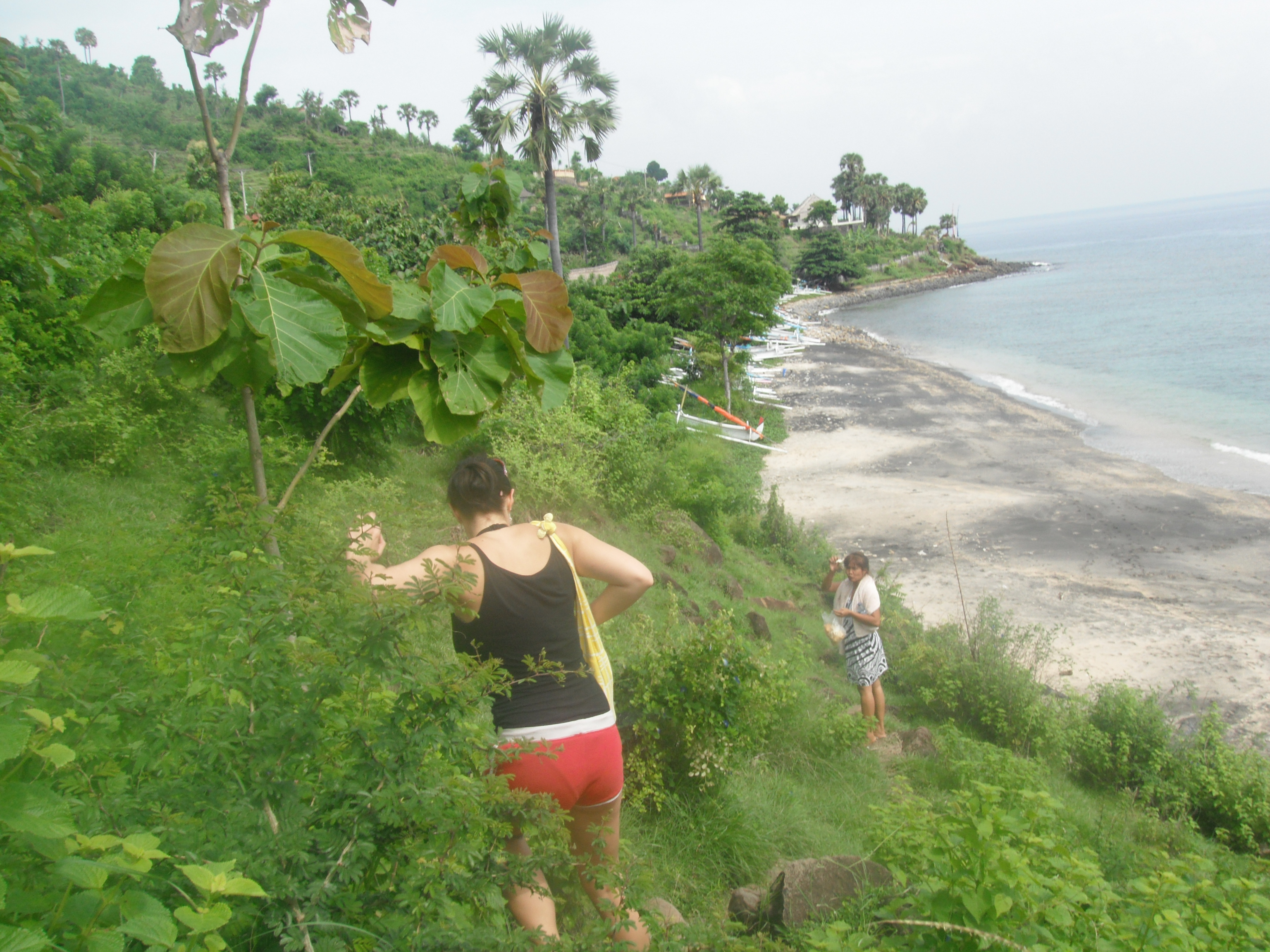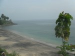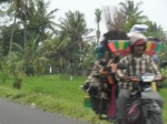Nach 3 Bier machten wir gegen halb zwoelf dann wieder zurueck und fielen totmuede ins Bett. Am naechsten Tag gabs dann mal wieder lecker Fruehstueck am Bungalow, diesmal Jaffal (wie ein Pancake mit eingebackenen Bananen), Fruechteteller und Kaffee. Dann packten wir wieder unsere 7 Sachen, checkten aus und schleppten uns dann zu unserem Fahrer. Die Fahrt von Ubud Richtung Amed war ziemlich lang, aber sehr cool. Fuhren durch schoene Gegenden, ueberall Reisfelder und Berge. Sahen auch wieder total viele Roller und Motorraeder rumfahren. So geil, manchmal sassen da 4 Leute auf einem Roller oder da war ein halber Marktstand hinten draufgeladen 😉 Sah manchmal echt witzig aus. Nach fast 3 Stunden Fahrt erreichten wir Amed und dort mussten wir dann tatsaechlich nochmal umgerechnet ca. 5 EUR draufzahlen, weil das Hotel wo wir jetzt sind, ca. 9 km entfernt von Amed liegt… Naja, eh wir uns nochmal ein Taxi haetten nehmen muessen, haben wir das lieber bezahlt. Die Strecke bis zum Hotel war ganz schoen krass, die Strassen waren schlimmer als an Irlands Westkueste… Erreichten dann endlich unser Ziel und trafen auf dem Parkplatz gleich auf Ilu und Georg, denen die Anlage gehoert. Den Tipp fuer das Hotel bekamen wir uebrigens von Tony, der mit dem Ehepaar befreundet ist. Georg ist uebrigens Amerikaner, wohnt aber schon seit ueber 10 Jahren hier. Hatten Glueck und bekamen ohne Reservierung einen supertollen Bungalow mit Rabatt, quasi der Freunde-Bonus 😉 Die Aussicht vom Bungalow aus, ist einfach der Hammer. Die Anlage liegt auf einem Huegel, unser Bungalow steht auf kleinen Stelzen und man sieht von hier oben das Meer und hoert die Wellen rauschen, traumhaft! Waehrend unser Zimmer saubergemacht wurde, haben wir ne Kleinigkeit im Restaurant gegessen, uns danach umgezogen und Schnorchelausruestung gemietet. Gleich vor dem Hotel liegt ein japanisches Wrack im Wasser, was wir natuerlich erkunden wollten. Dann stiess noch ein Einheimischer zu uns und zeigte uns das Korallenriff und dann auch das Wrack, soooo geil 😉 Als unsere Finger dann schrumpelig waren, gingen wir wieder raus, wo wir am Strand Dede trafen, der hier wohnt. Unterhielten uns ne Weile mit ihm und er bot uns an, dass wir abends in ein lokales Bistro gehen koennten, wo er Indonischischen Reggae und balinesische Musik spielen wuerde. Sagten nach etwas zoegern dann auch zu, no risk, no fun 😉
