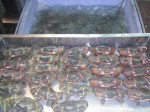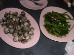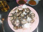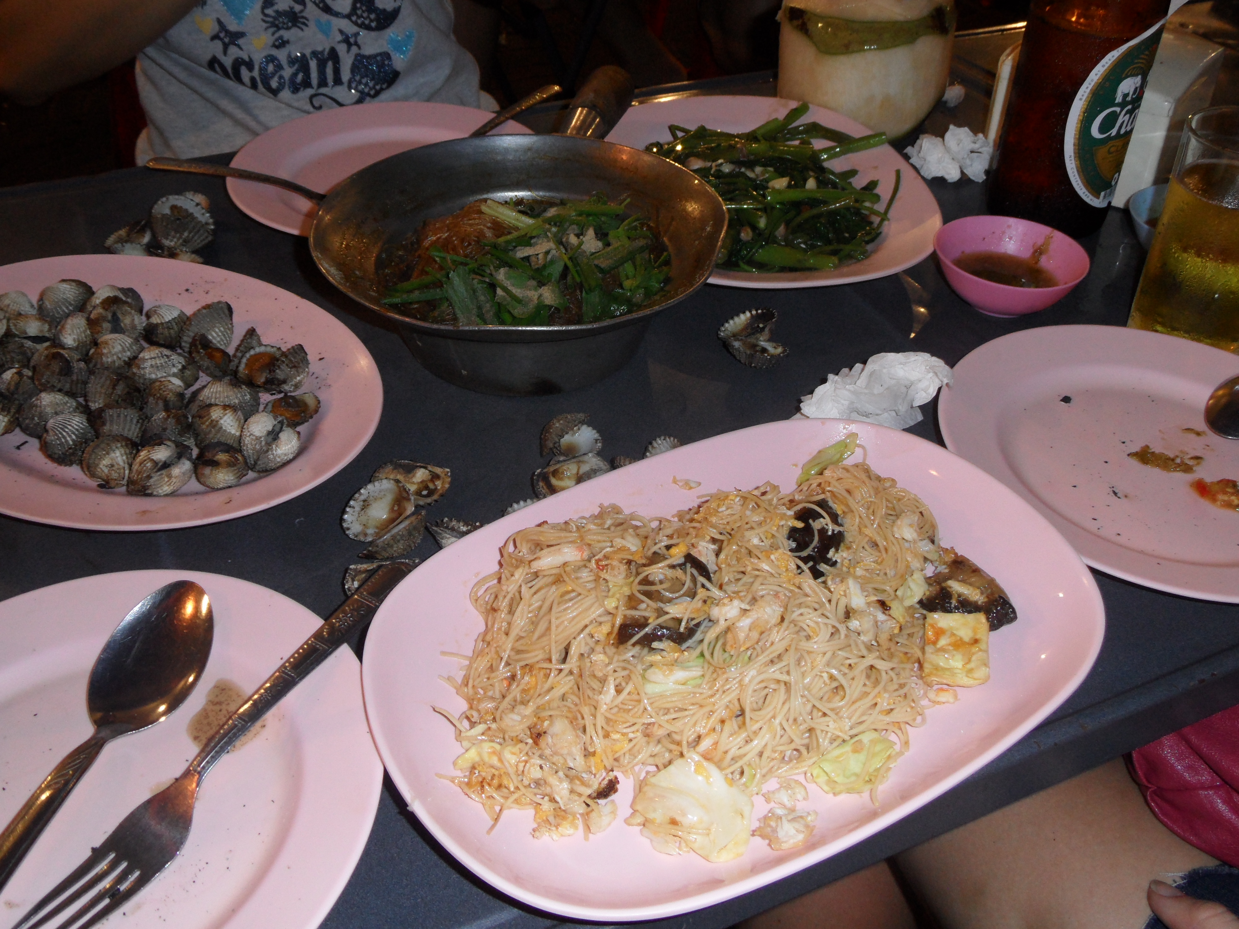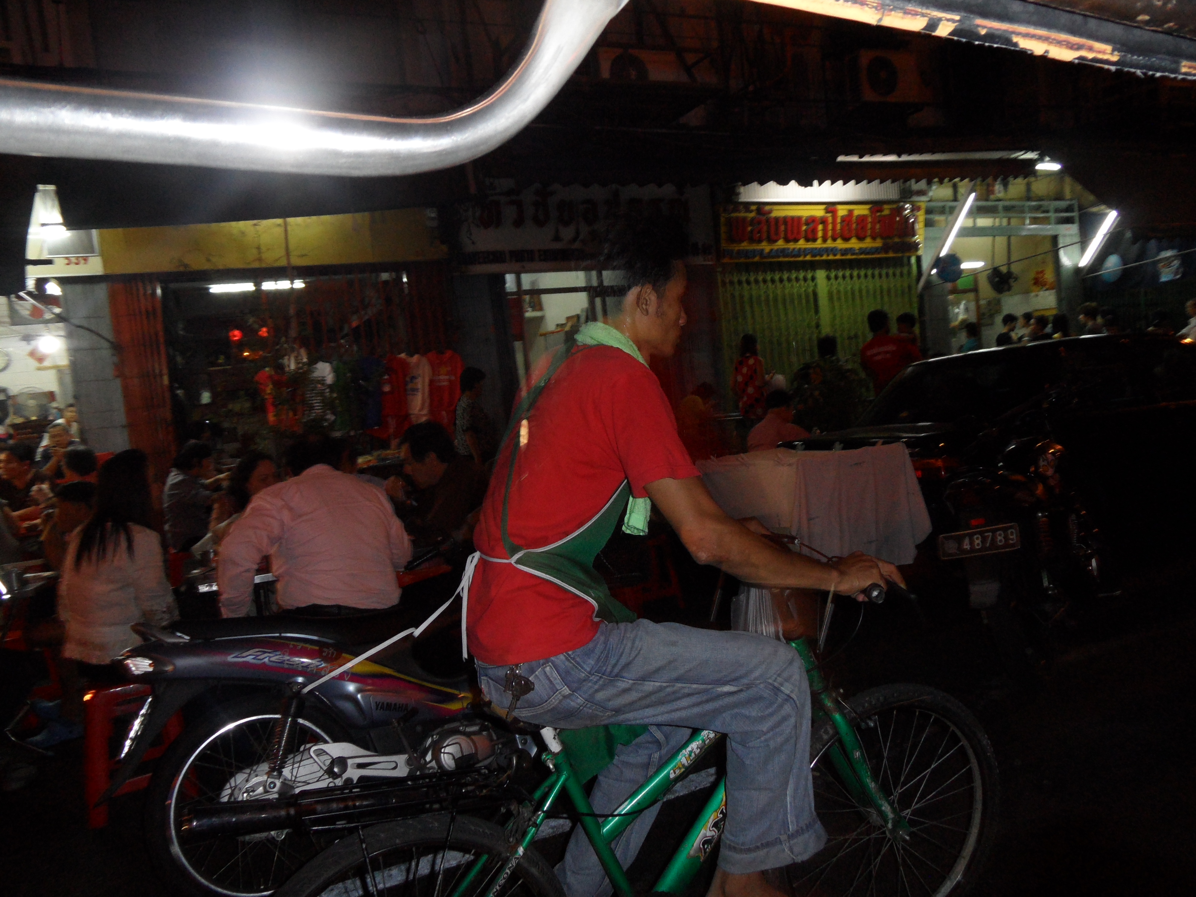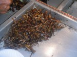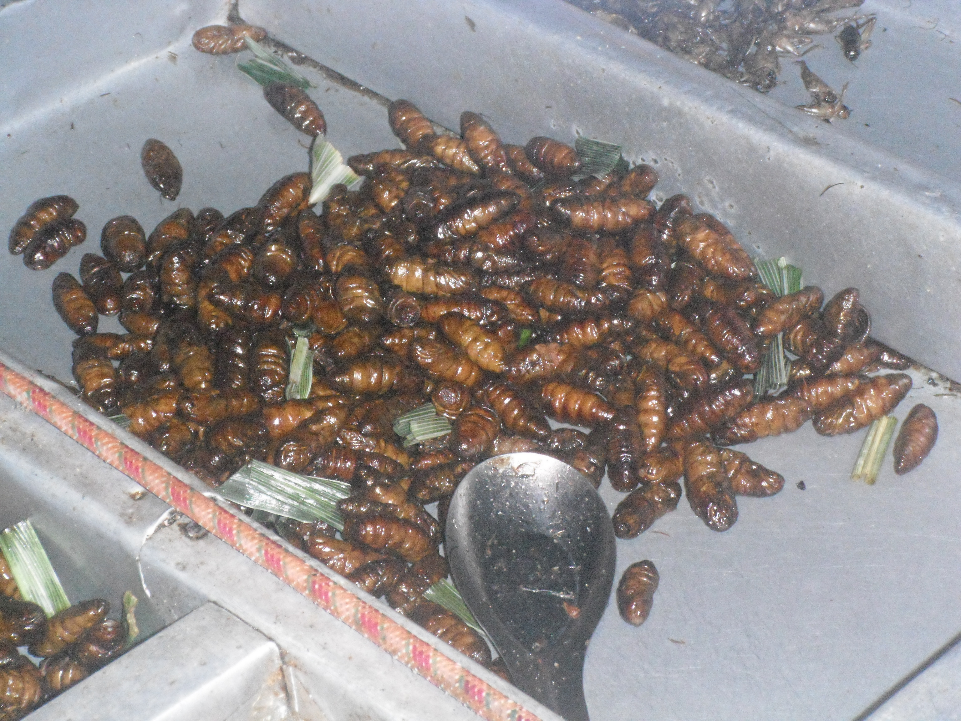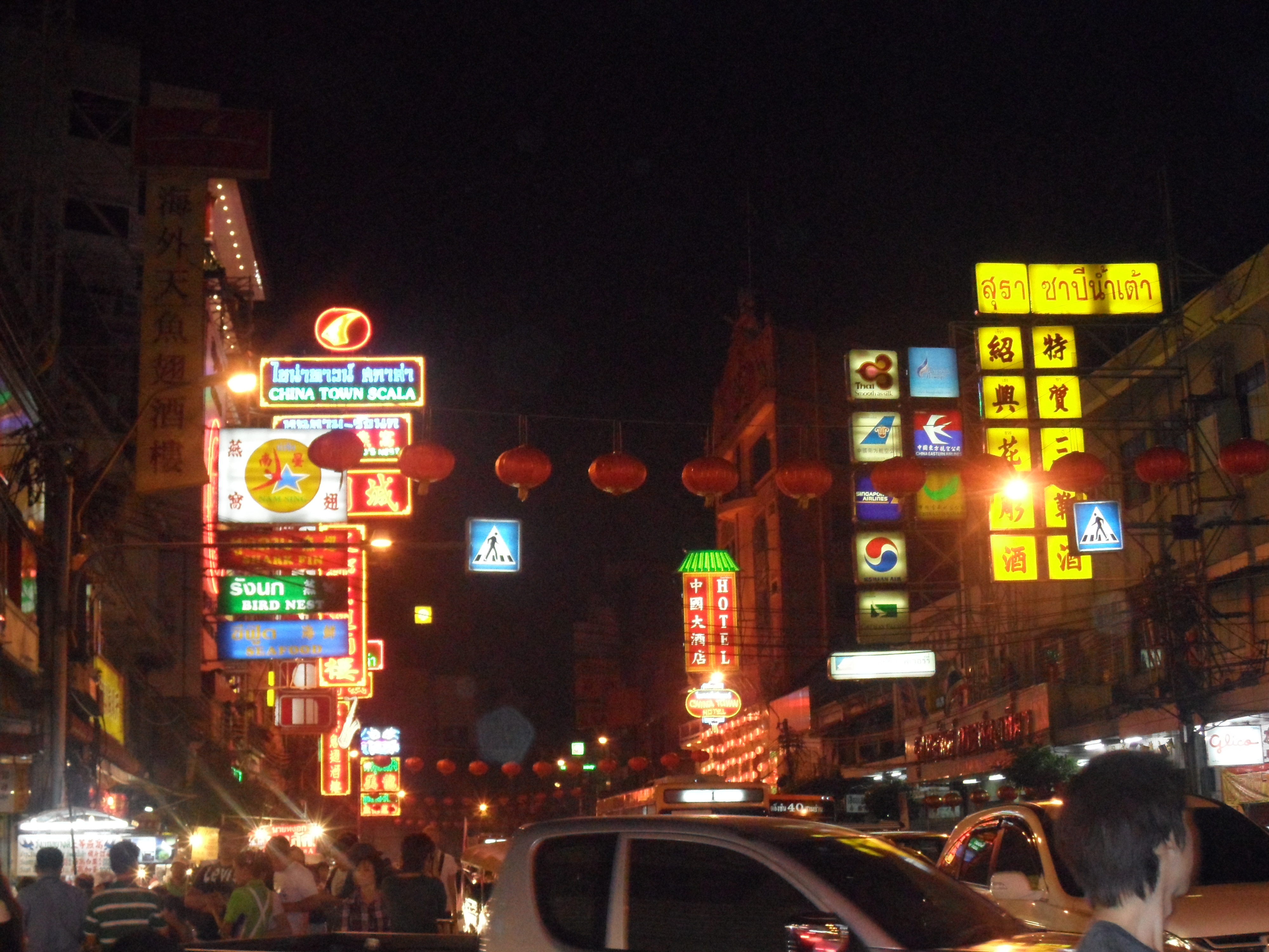 Nachdem wir das alles erledigt hatten, nahmen wir uns ne Tuk-Tuk Richtung Hotel, wofuer wir jeder 11 EUR inkl. Fruehstueck zahlten. Eine Tuk Tuk ist uebrigens eine Auto- oder Motorradrikscha in Südostasien. Ich sag euch das war ne Fahrt, ich hab fast nur geschrien und gelacht 😉 Mein Rucksack und Jenny’s Koffer standen vor uns und wir versuchten diese panisch mit unseren Beinen festzuhalten, da die Seiten offen waren 😉 Und unser Fahrer ist auch nicht gerade langsam gefahren 😉 Was geileres hab ich selten erlebt! Der Verkehr war auch unvorstellbar, normalerweise brauch man fuer die Strecke durch Chinatown wohl nur 10 Minuten, wir waren fast 30unterwegs! Erreichten schliesslich unser Hotel ‚White Orchard‘ und bezahlten 60 Baht, also 1.45 EUR insgesamt, fuer die Fahrt. Checkten dann ein und fuhren hinauf in den 5. Stock, wo wir ein schoenes, sauberes Zimmer vorfanden. 20 Uhr wurden wir dann von Mayuree abgeholt. Sie ist Thailaenderin und hat vor ca. 12 Jahren ein Austauschjahr in Deutschland gemacht. Den Kontakt zu ihr haben wir von Jenny’s Papa bekommen. Ist echt richtig super mit ihr gewesen. Alleine haetten wir glaub ich nicht so ne super Zeit gehabt, da es wirklich einfacher ist, wenn man mit jemand Einheimischen unterwegs ist. Und es war so unglaublich viel los auf der Strasse, das kann man gar nicht beschreiben, so viele Autos, Tuk Tuks, Roller und noch dazu die Menschenmassen, oh man… Fanden schliesslich 3 Plaetze in einem ziemlich vollen Restaurant, wo wir direkt an der Strasse sassen. Als wir die Karte lasen, waren wir leicht ueberfordert, doch dank unserer Begleitung bestellten wir schliesslich folgendes: Muscheln, Nudeln mit Krabbenfleisch, Gemuese und Glasnudeln mit Scampi. Dazu gab es noch Kokosnussmilch und Chang Bier 🙂 War wirklich alles super lecker und mal was total anderes, so in diesem Gewuehl zu essen! Vollgestopft stiefelten wir weiter, da Mayuree uns noch ein typisches Dessert zeigen wollte. Auf dem Weg kamen wir dann an DEM Stand vorbei. Jaaa, liebe Leute, die verkaufen tatsaechlich gegrillte Insekten in Thailand! Naja, ich haette nie gedacht, dass ich das mal tun werde, aber ICH habe tatsaechlich einen gegrillten Mehlwurm gegessen und musste mich NICHT uebergeben! Hihi, hat eigentlich nach fast gar nix geschmeckt, musste mich halt nur etwas ueberwinden… Hatte einen leichten Nachgeschmack, den ich nicht wirklich beschreiben kann. Morgen gibt’s dann Heuschrecke 😉