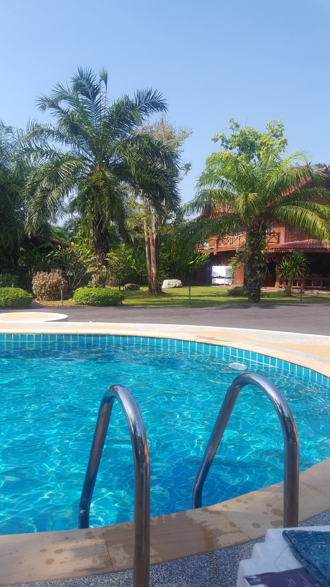 Am Pier von Krabi angekommen, wurden wir natürlich sofort von Taxifahrern belagert, aber das Hotel, was ich gebucht hatte, lag nur wenige Gehminuten entfernt und somit machten wir uns zu Fuß auf dem Weg zum Thalen Palm Paradise Resort, wo wir kurz nach 12 Uhr schon einchecken konnten. Nach den letzten rustikalen Tagen, hatte ich uns für heute Nacht noch mal ein wenig Luxus für 24 EUR gebucht. Wir haben hier einen schönen großen Bungalow aus Stein, mit Klimananlage und Pool, wo wir den heutigen Tag nochmal entspannen konnten. Zum Mittag liefen wir ein paar Meter zum Pier zurück, wo wir nochmal günstig essen konnten und den Rest des Tages verbrachten wir am Pool, mit Lesen, Baden und sonnen. PERFEKT!