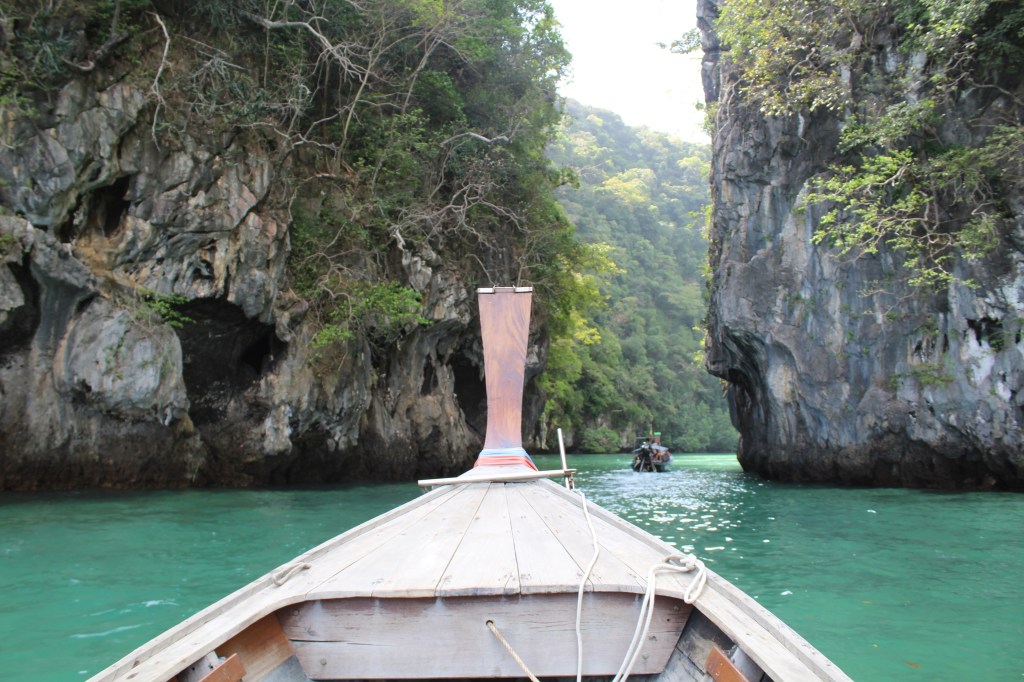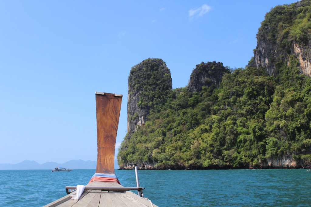 Verbrachten dann noch ein wenig Zeit auf der Terrasse und dann stand auch schon die letzte Nacht im Paradies an. In den Schlaf gesungen von etlichen Zikaden, Vogelgesängen und Geckorufen, mit einer sanften Brise in der Nase, konnten wir die letzte Nacht nochmal sehr gut schlafen, abgesehen von der morgendlichen Moschee-Beschallung um 5:30 Uhr.Gegen 9 Uhr gingen wir dann wieder frühstücken, zahlten unsere Rechnung und dann packten wir unseren Kram wieder mal zusammen. 11 Uhr checkten wir schließlich aus und liefen die paar Minuten zum Pier, wo wir für 150 Baht Tickets für ein Longtail-Boot Richtung Krabi kauften, welches 11.30 Uhr abfuhr. Die Fahrt war super entspannt, wenn man von einer Thai-Frau absieht, die ca. 20 Minuten damit verbrachte in ihr Handy zu schreien, in einer Stimme die an Donald Duck erinnerte. Marco und ich machten es uns draußen gemütlich, während die anderen Passagiere im überdachten Bereich platz nahmen und wir genossen die halbstündige Fahrt, vorbei an den vielen kleinen Inseln sehr.