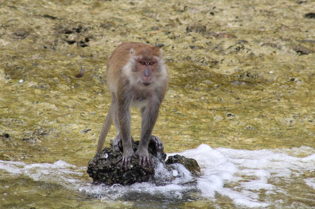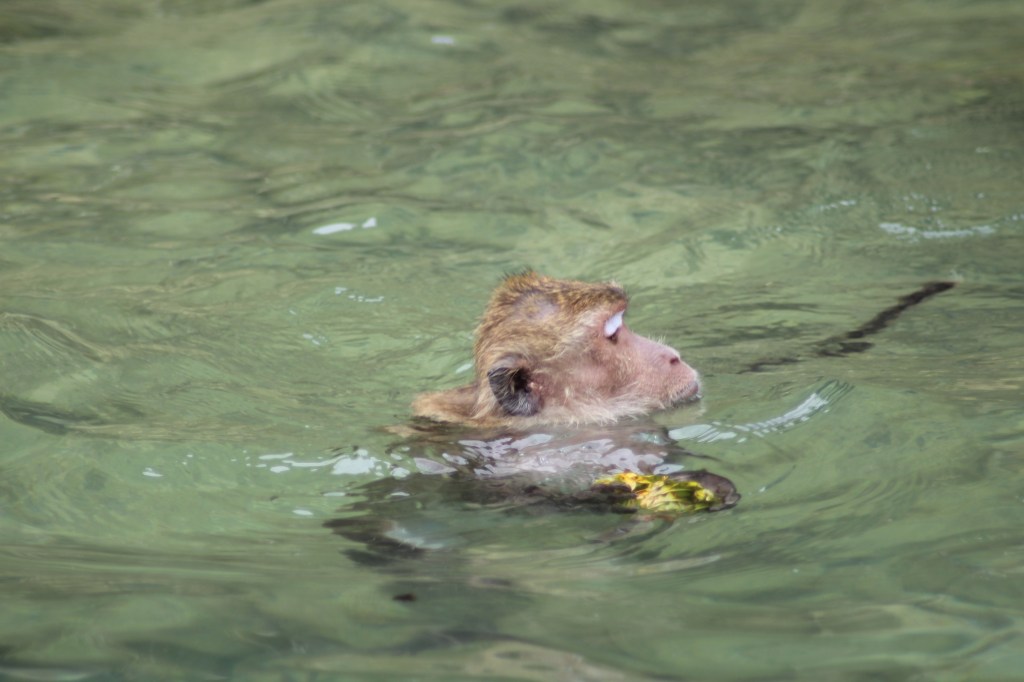 Das Wetter war herrlich, die Inseln traumhaft und das Wasser war auch glasklar und wir genossen die 4 Stunden total. Wir steuerten diverse Inseln an, gingen schnorcheln, lagen an einsamen Traumstränden, gegen die Maya Bay ein Witz ist und genossen es, dass dort noch ein wenig Ruhe herrscht, im Gegensatz zu den anderen überlaufenen Touristenorten Thailands. Ein Highlight war die Insel Monkey Island, wo eine Horde von Affen lebt. Wir hielten kurz vor dem Strand an und unser Kapitän warf ein paar Ananasreste ins Wasser und tatsächlich, die Affen schwammen sogar ins Meer raus, um sich die Stücke zu holen, einer tauchte sogar zurück, genial!