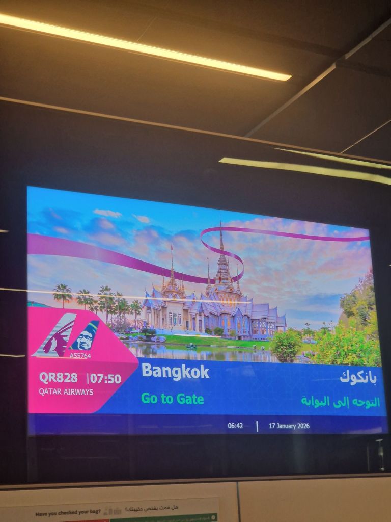 Kurz vor 22 Uhr ging es dann in den Flieger. Diesmal flogen wir mit Qatar Airways, über Doha, nach Bangkok.