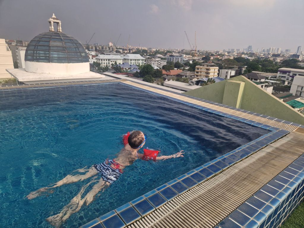 Nachdem wir eingecheckt und die Sachen ins Zimmer gebracht hatten, ging es (endlich) zu unserem Lieblings-Shop in TH, 7/11 😅 Dort deckten wir uns mit Futter und Getränken ein und dann checkten wir die Dachterrasse des Hotels aus, wo sich auch ein Pool befindet 🤩 Nach einem ersten erfrischenden Chang, gingen wir zurück ins Zimmer, wo wir endlich duschen und uns etwas frisch machen konnten. Als der Kleine endlich im Bett war, chillte ich mit Marco noch ne ganze Weile auf dem Balkon und wir genossen es einfach, wieder hier zu sein.