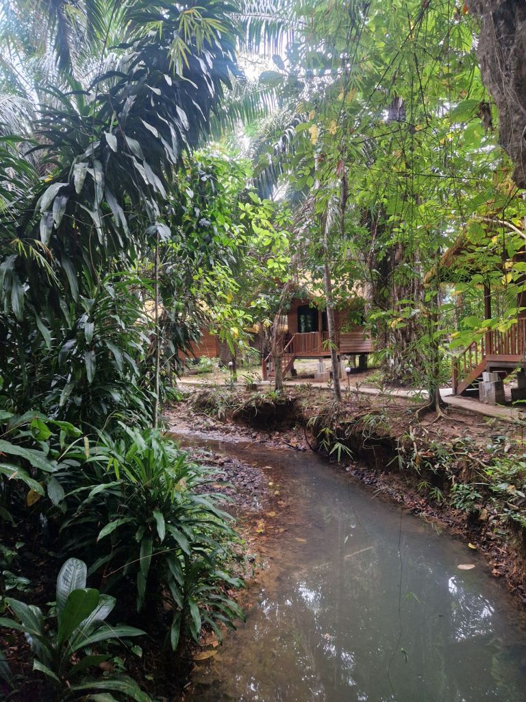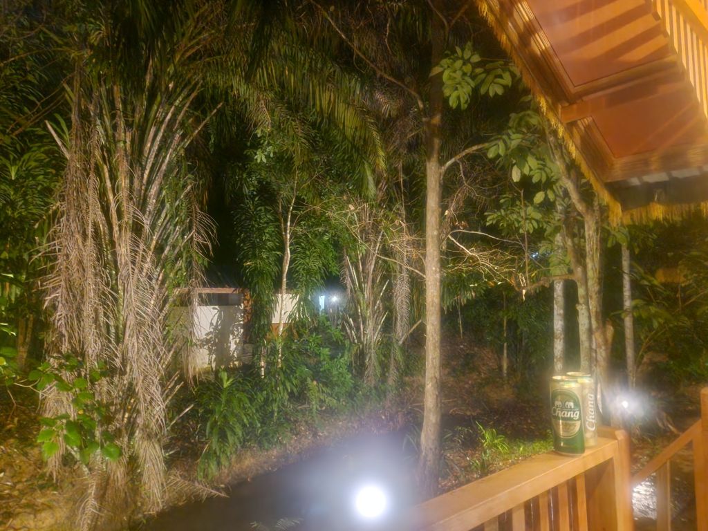 Als wir dann alle satt waren, checkten wir schließlich ein. Wir haben hier eine Hütte, an einem kleinen Fluß, direkt im Dschungel. Drin befinden sich 2 Doppelstockbetten, 2 Ventilatoren und 2 schmale Schränke und dahinter ein kleines Bad, mit Klo und Dusche. Alles sehr spartanisch, aber für uns ausreichend. Die Betten sind auch alle jeweils mit einem Moskitonetz ausgestattet, was ganz gut ist. Außerdem befindet sich vor der Hütte noch eine kleine Veranda mit 2 Sitzbänken an jeder Seite, die sehr zum Chillen einläd. Der Kleine ging dann halb zehn Uhr rum schlafen und wir lasen dann noch bis 23 Uhr, umhüllt vom tropischen Regenschauer, der natürlich einsetzte, als ich gerade Chang-Nachschub im Restaurant besorgte.