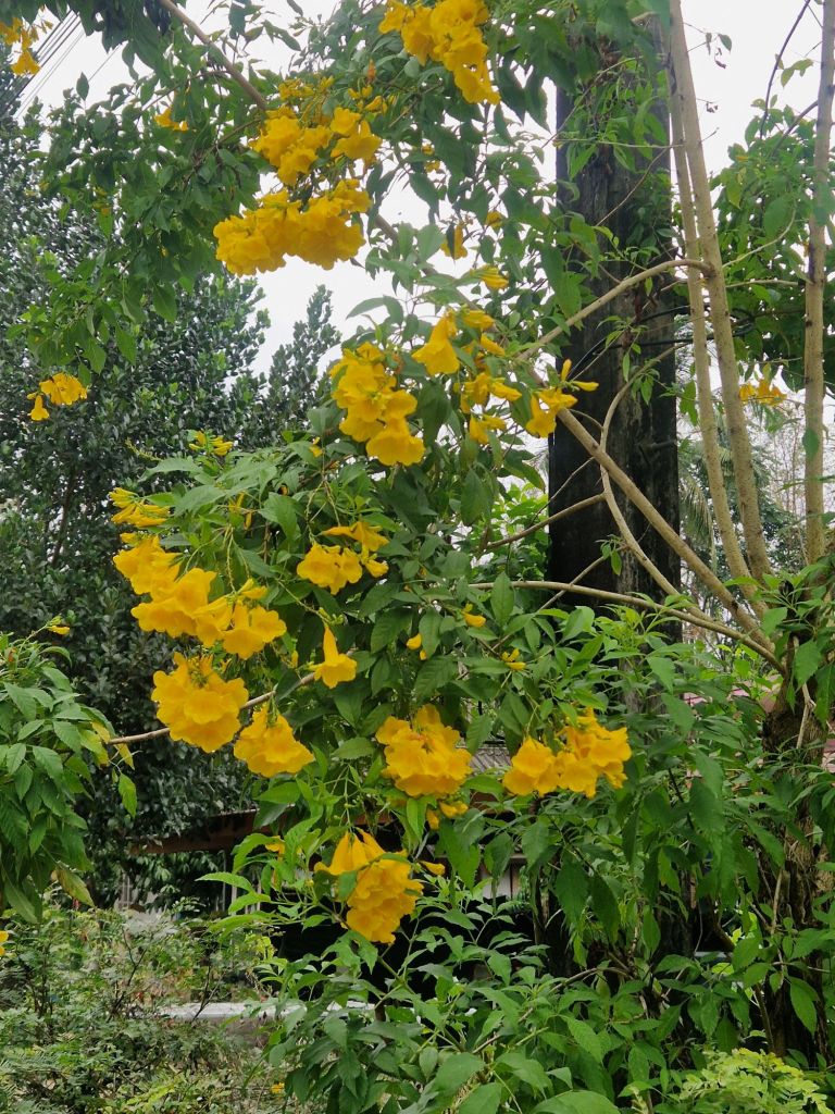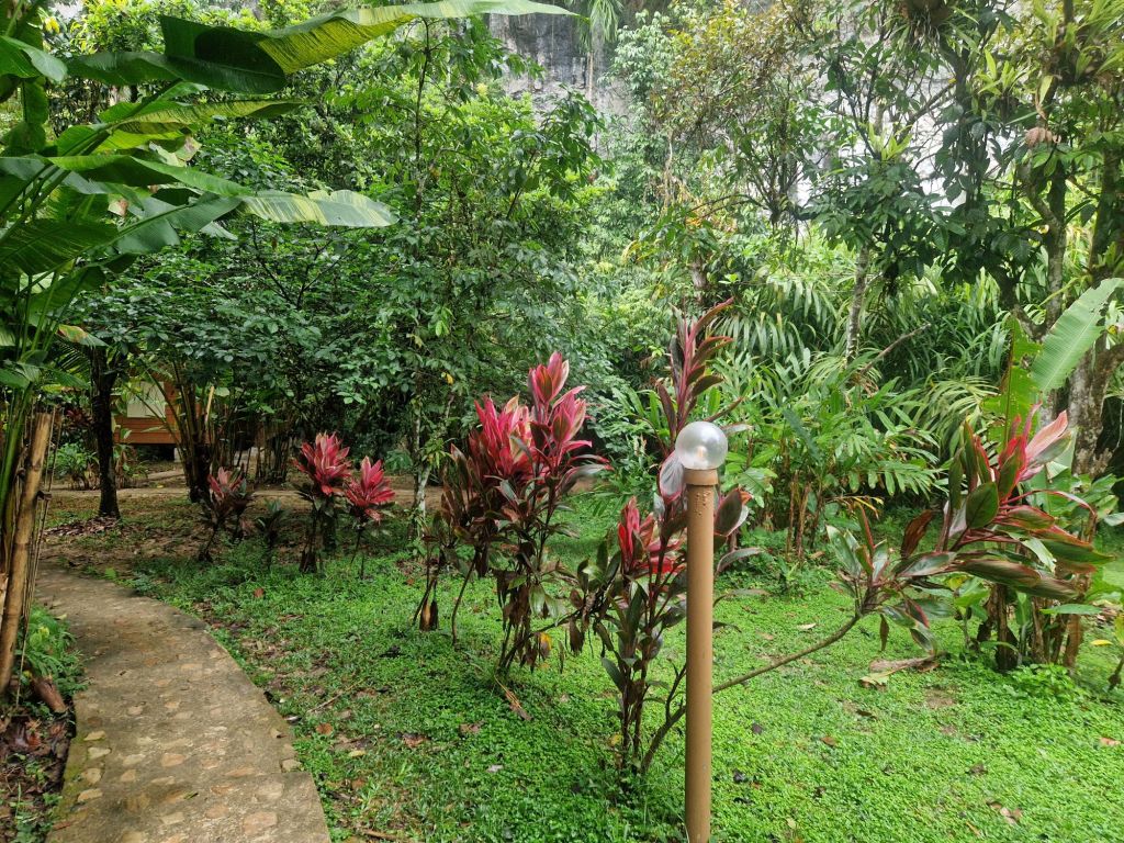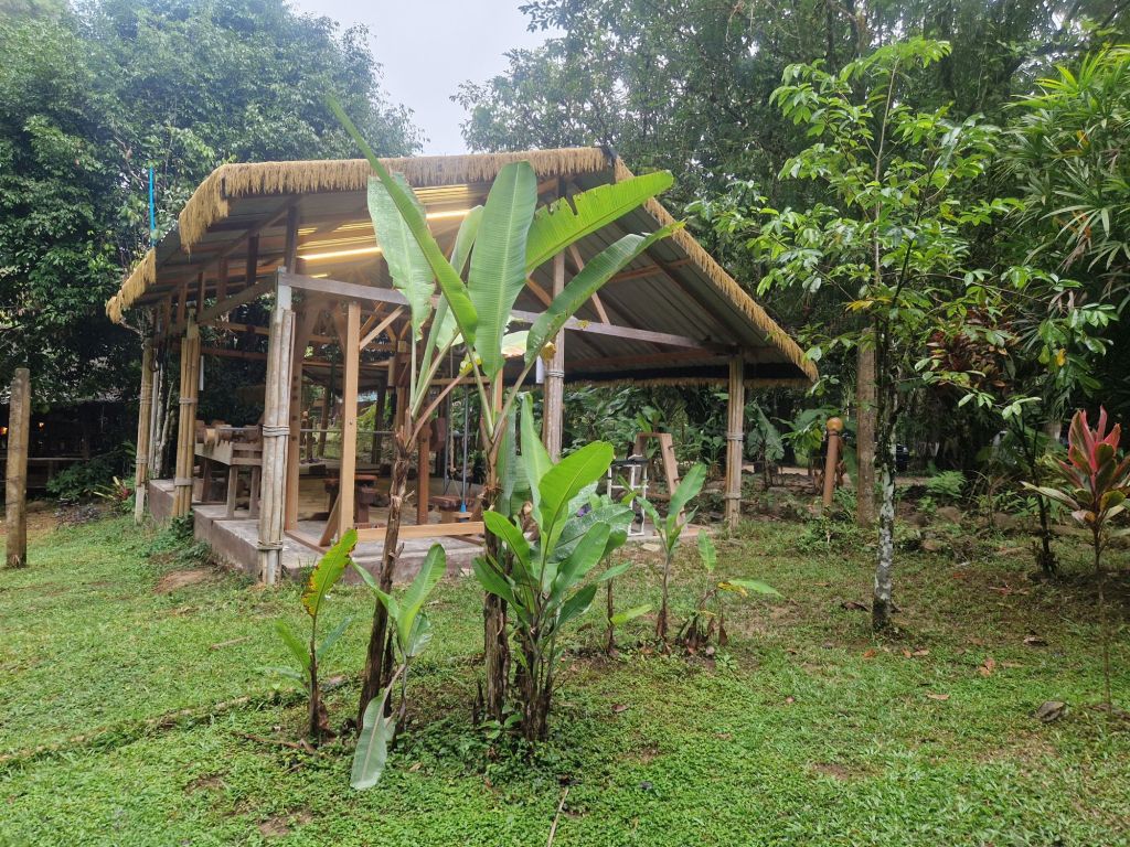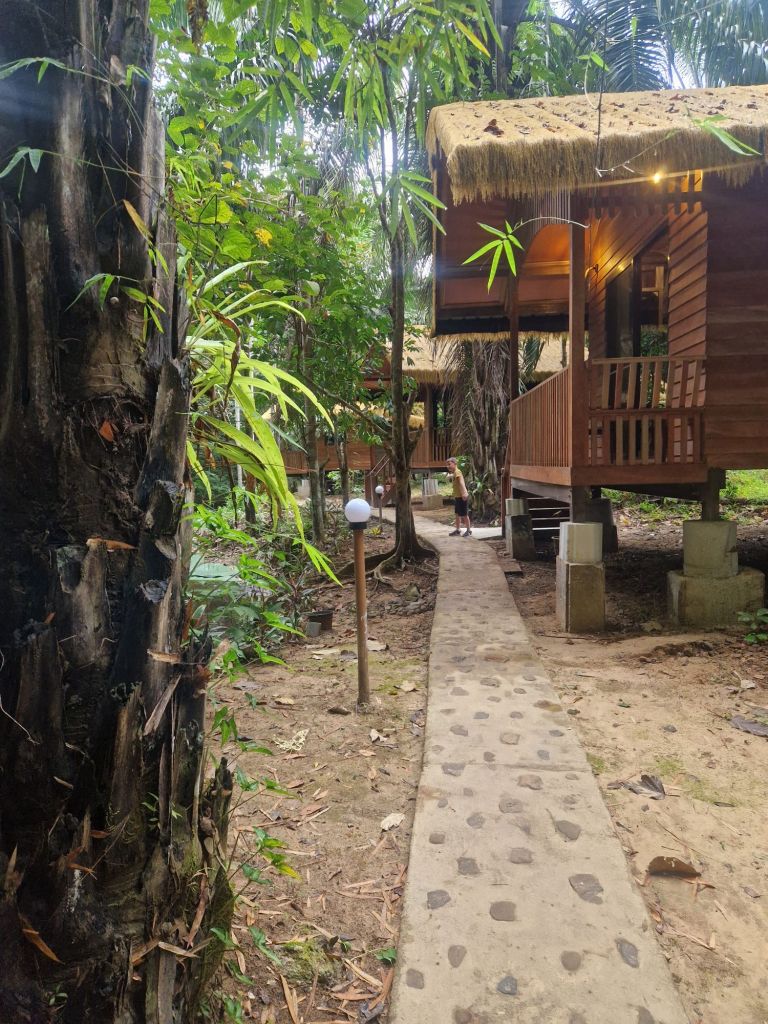 Auf jeden Fall ist es wirklich super schön hier. Die Anlage ist direkt im Dschungel, neben einem riesigen Kalksteinfelsen, gebaut. Es gibt mehrere Hütten verteilt im Areal, einen großen, überdachten Aufenthaltsbereich, wo es auch die Mahlzeiten gibt. Dann noch das Holz-Fitnessstudio und ansonsten nur Palmen und andere exotische Bäume und Pflanzen.