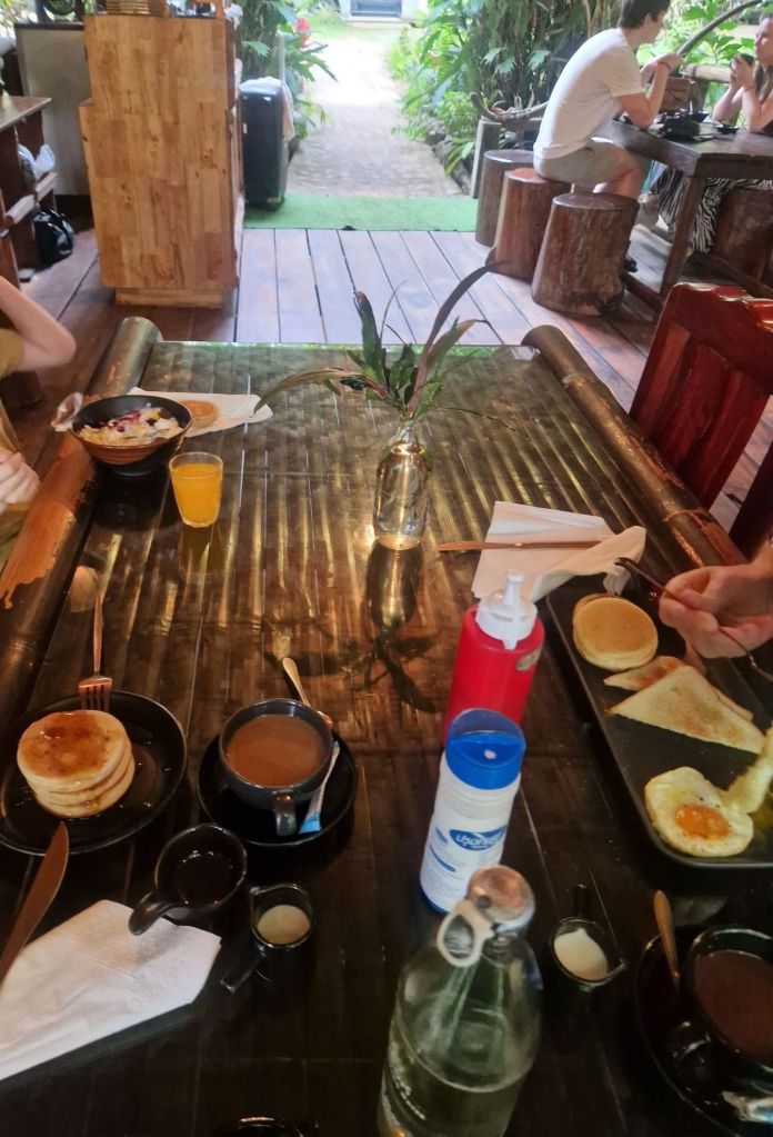 Ich ging dann bald raus und lauschte den Dschungellauten und sah auch einen ersten kleinen Affen, im Baum über mir rum hangeln. Gegen halb 8 waren auch meine Männer wach und wir gingen dann kurz nach 8 Uhr zum Frühstück.  Dort gab es Joghurt, Müsli und Obst für Leo, ich hatte einen Pancake-Turm und Marco eine Frühstücksplatte, dazu gab es Kaffee bzw. Saft.